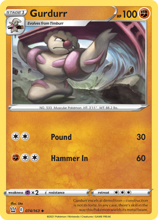 Gurdurr excels at demolition—construction is not its forte. In any case, there’s skill in the way this Pokémon wields its metal beam.